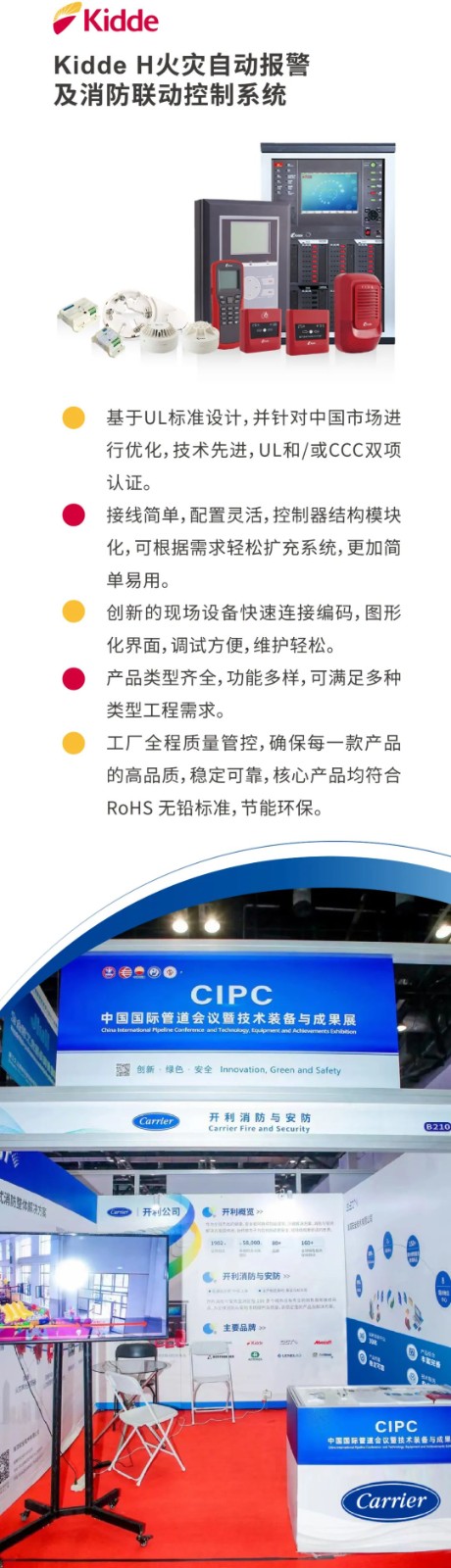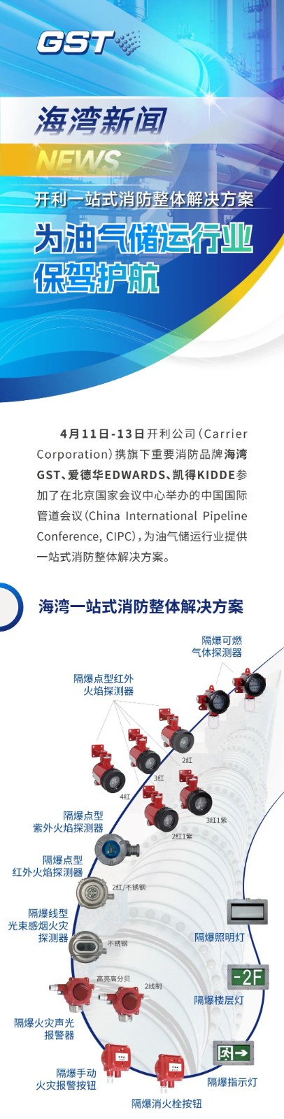 4月11日-13日開(kāi)利公司(CarrierCorporation)攜旗下重要消防品牌海灣GST、愛(ài)德華EDWARDS、凱得KIDDE參加了在北京 會(huì)議中心舉辦的中國(guó)國(guó)際管道會(huì)議(Chinalnternational PipelineConference,CIPC),為油氣儲(chǔ)運(yùn)行業(yè)提供一站式消防整體解決方案。